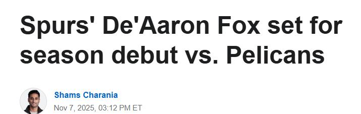 根據ESPN著名記者Shams在節目中透露,馬刺隊後衛福克斯將於北京時間週日對陣新奧爾良鵜鶘隊的比賽中完成本賽季首秀。