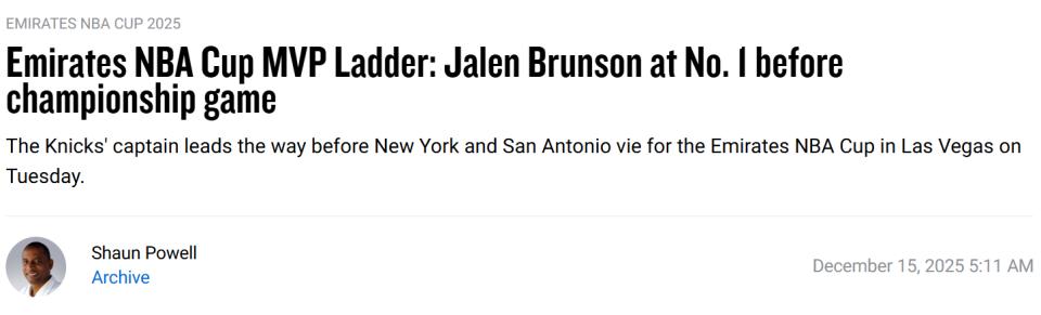 布倫森在最近兩場杯賽中,自比賽開始即火力全開。對陣魔術的上半場,他獨得25分;對陣猛龍的首節,他即砍下20分。此前對雄鹿時,他貢獻37分,助尼克斯成功晉級淘汰賽。布倫森在場上展現的球商與關鍵球能力,為球隊注入強大信心。