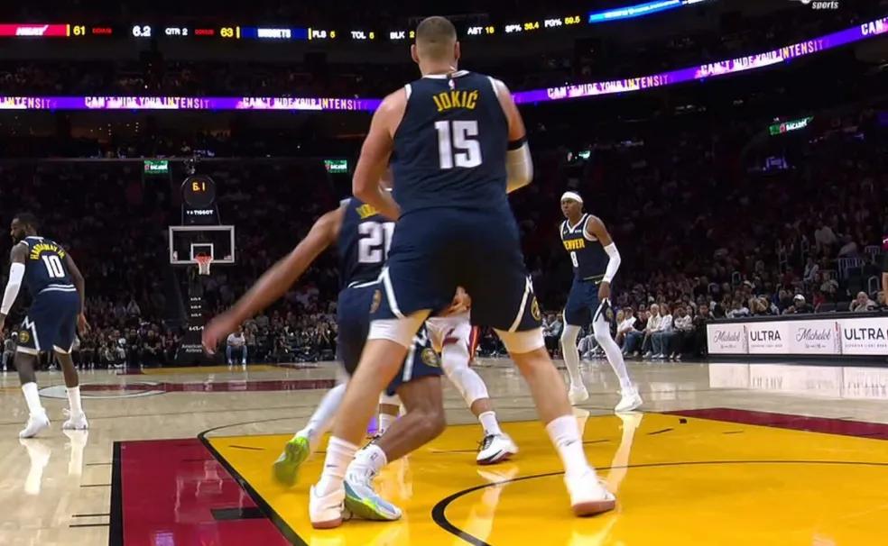 約基奇在防守時被隊友瓊斯不慎踩到腳,導致膝蓋扭傷。