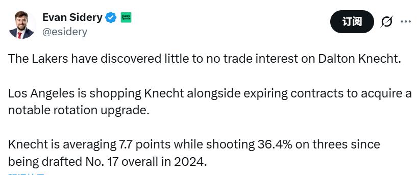此外,Sidery還報導,湖人隊發現聯盟各隊對克內克特的交易意願幾乎為零。湖人方面曾計劃將克內克特與到期合約一同打包交易,以期換來能明顯提升球隊輪換實力的球員。