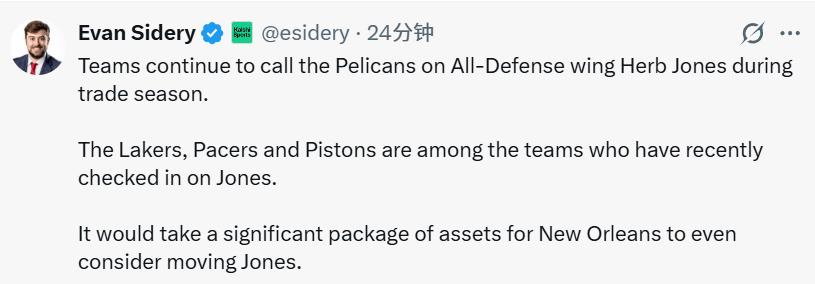 北京時間1月24日,根據名記Sidery報導,在交易窗口期,多支球隊持續向新奧爾良鵜鶘隊探詢全明星級防守側翼赫伯特-琼斯的交易意向。洛杉磯湖人、印第安納步行者以及底特律活塞近期均就琼斯的交易可能性向鵜鶘隊進行了諮詢。想要讓鵜鶘隊認真考慮放走琼斯,必須拿出一份包含大量優質籌碼的交易方案。