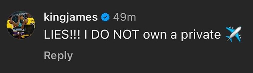 那篇帖子還稱詹姆斯擁有一架灣流私人飛機,對此,詹姆斯也明確表示這些說法都是不實資訊。