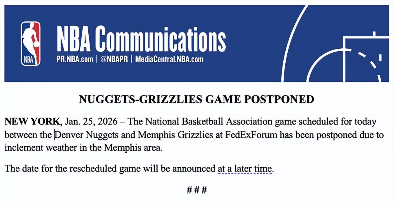 北京時間1月26日,因全美大部分區域遭遇強烈冬季風暴,原計劃今日舉行的掘金對灰熊及獨行俠對雄鹿的NBA常規賽均被迫延期,補賽時間待後續公布。