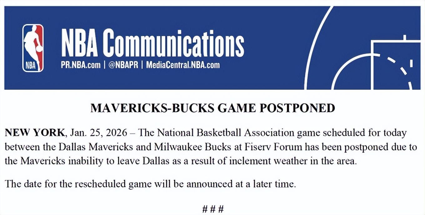 此外,依照原定計劃,密爾瓦基雄鹿隊將於北京時間今日上午8點在主場迎戰獨行俠隊,但獨行俠隊於當地時間週六晚間未能順利抵達密爾瓦基,目前球隊仍滯留達拉斯。NBA官方同樣宣布,該場比賽因惡劣天氣原因延期,補賽時間將另行公布。