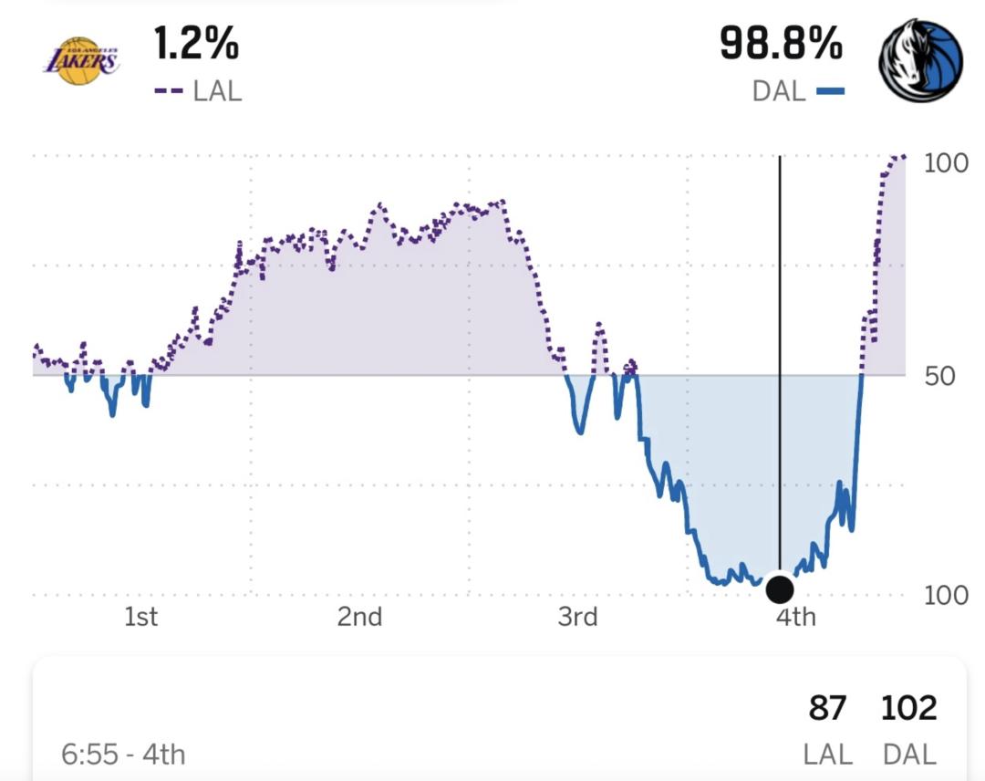 第四節最後6分55秒,獨行俠仍以102-87領先,當時他們的勝率高達98.8%。隨後湖人突然覺醒,以一波29-8的強勢攻勢逆轉比賽。