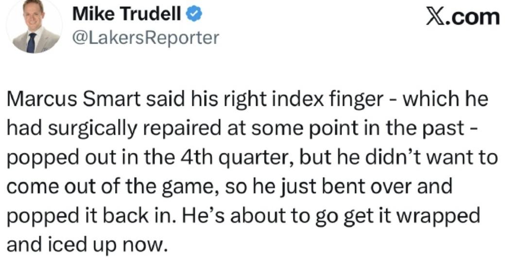 還有一位關鍵人物值得關注。NBA記者Mike Trudell報導,斯瑪特在昨天第四節比賽中遭遇右手食指(過去曾接受手術修復)脫臼,但他不願退場,直接彎腰徒手將手指復位,賽後接受包紮和冰敷處理。
