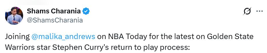 Shams表示,柯瑞恢復穩定向好,如果一切順利,有望在3月底前歸隊。他在《NBAToday》節目中說道:「目前外界持謹慎樂觀態度,史蒂芬-柯瑞有望在本月某個時候重返陣容。據我了解,他週二下午(當地時間)在波士頓進行了一次效果很好的場上訓練,開始奔跑、變向、移動,甚至進行輕微對抗,有點變回我們熟悉的那個柯瑞了。」