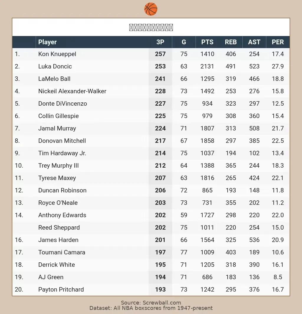 Currently, Doncic is only 4 three-pointers behind Knepper, so the competition for this season's three-point leader title remains highly uncertain. Both the Hornets and the Lakers have only 6 regular-season games left.