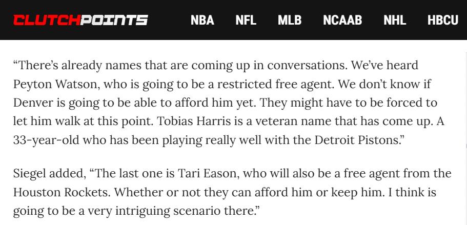 "Some names have already entered the discussion. We've heard about Peyton Watson, who will become a restricted free agent. It's unclear whether the Nuggets have the cap space to retain him, and at this stage they might have to let him go. Also mentioned is veteran Tobias Harris, the 33-year-old player who has performed exceptionally well this season with the Detroit Pistons."