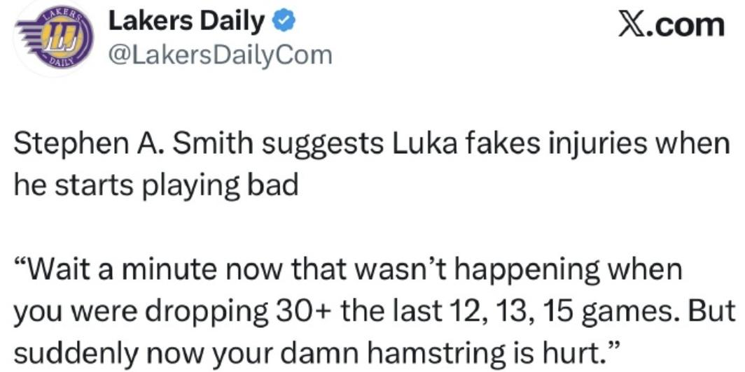 Late yesterday, prominent commentator Stephen A. Smith suggested on a TV program that Doncic pretends to be injured when his performance declines. He said, "Wait, you were scoring over 30 points for 12, 13, 15 consecutive games without any injury issues, and now suddenly your hamstring is hurt?"