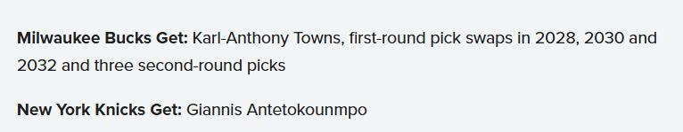 Bucks receive: Karl-Anthony Towns, 2028/2030/2032 first-round pick swap rights, three second-round picks