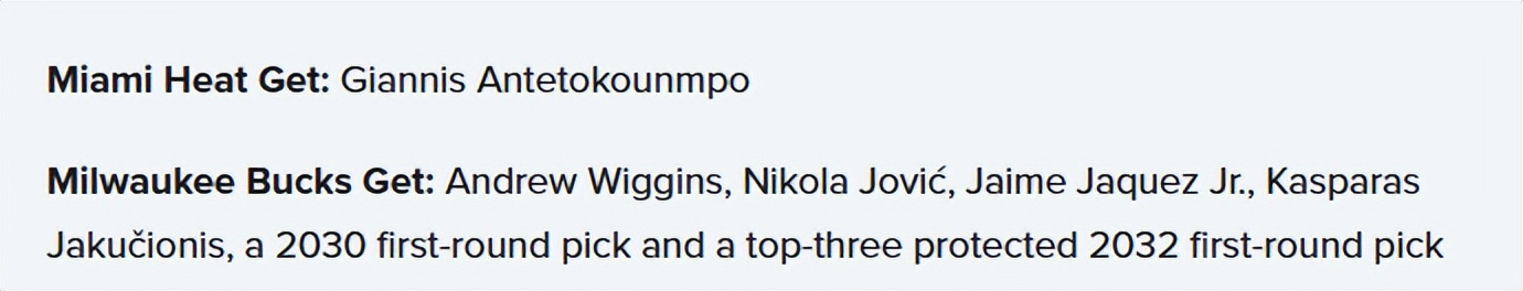 Wiggins' contract expires in 2026-27 and is not excessively high, allowing the Bucks to trade him later for more assets. Jović, Jaquez, and Jović can immediately inject potential into the Bucks' lackluster young core. The 2030 and 2032 picks are long-term assets after Giannis' prime ends.