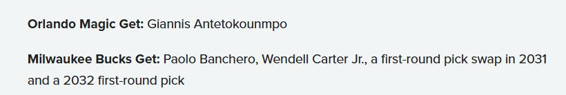 Bucks receive: Paolo Banchero, Wendell Carter Jr., 2031 first-round pick swap rights, 2032 first-round pick