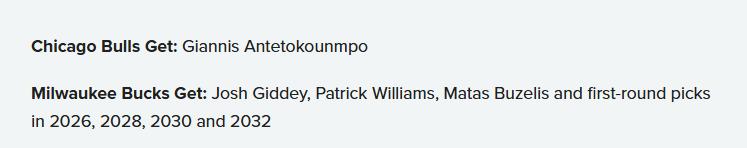 Bucks receive: Josh Giddey, Patrick Williams, Matas Buzelis, 2026/2028/2030/2032 first-round picks