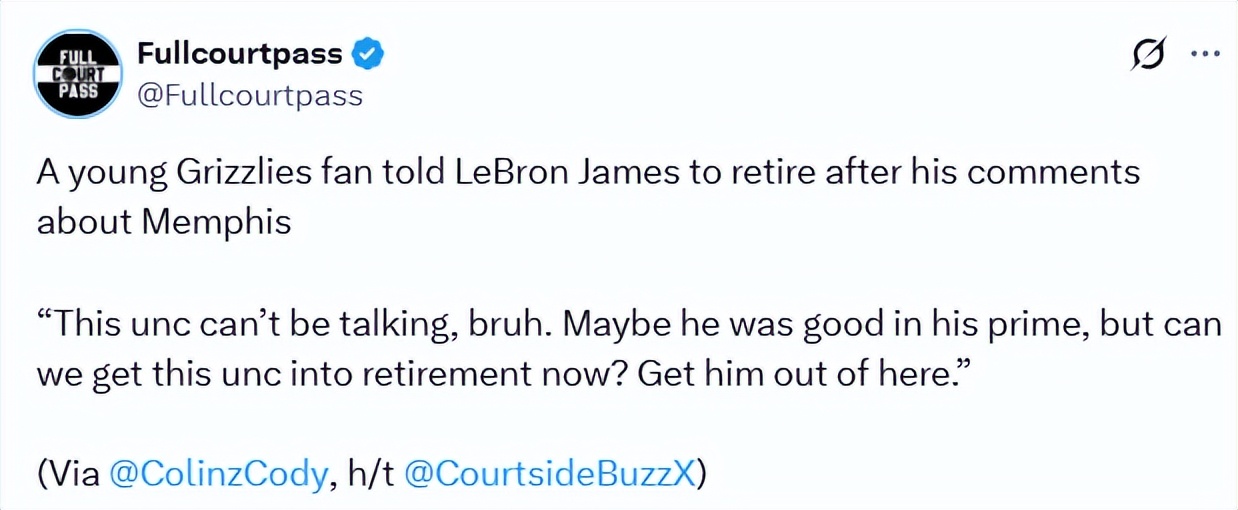 On April 6 Beijing time, after James made controversial remarks suggesting the Grizzlies relocate to Nashville, a young Grizzlies fan directly told him to retire.