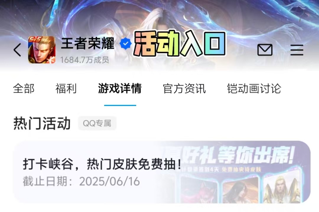 活動比較建議大家參與,活動入口在王者的官方遊戲頻道,找到“遊戲詳情”一欄,下拉看到“熱門活動”即為活動入口,目前活動剛開啟不久,建議儘早參加~