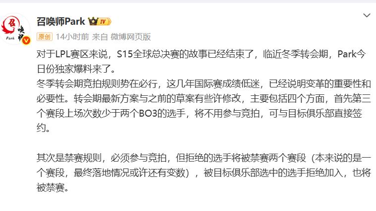 LPL隊伍全部被淘汰後,各大俱樂部已開始準備冬季轉會。LOL博主Park近日發文爆料了具體的轉會規則,據他透露,今年轉會期有四大改革。首先是選手競拍,第三賽段出場次數少於2場BO3的選手,無需參加競拍,可直接簽約;其次,選手若拒絕競拍,將遭官方禁賽。