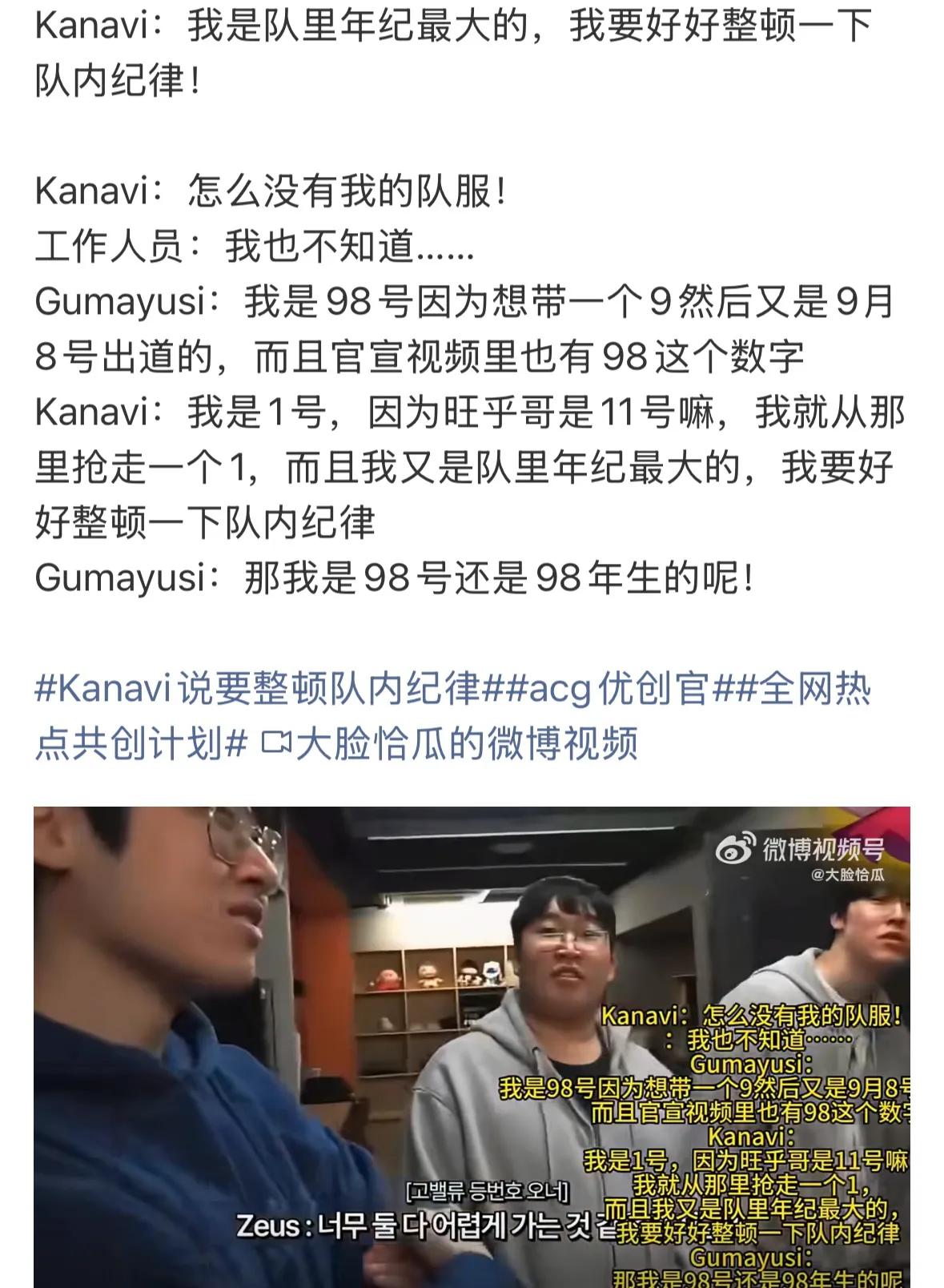 大家都知道,他之前是Griffin戰隊的替補打野選手,不僅沒有上場機會,連伙食都只能吃主力選手的剩飯。轉會加盟JDG戰隊後,他一步步崛起至今。可能也因為年齡增長,讓他變得有些肆無忌憚。在最近的影片中,Kanavi的一段互動引發全網玩家調侃。Kanavi:怎麼沒有我的隊服!工作人員:我也不清楚……Gumayusi:我是98號,因為想帶個9,然後又是9月8日出道,官宣影片中也有98這個數字。Kanavi:我是1號,因為旺乎哥是11號,我就從那裡搶了一個1,而且我又是隊裡年紀最大的,我要好好整頓一下隊內紀律。Gumayusi:那我是98號還是98年生的呢!