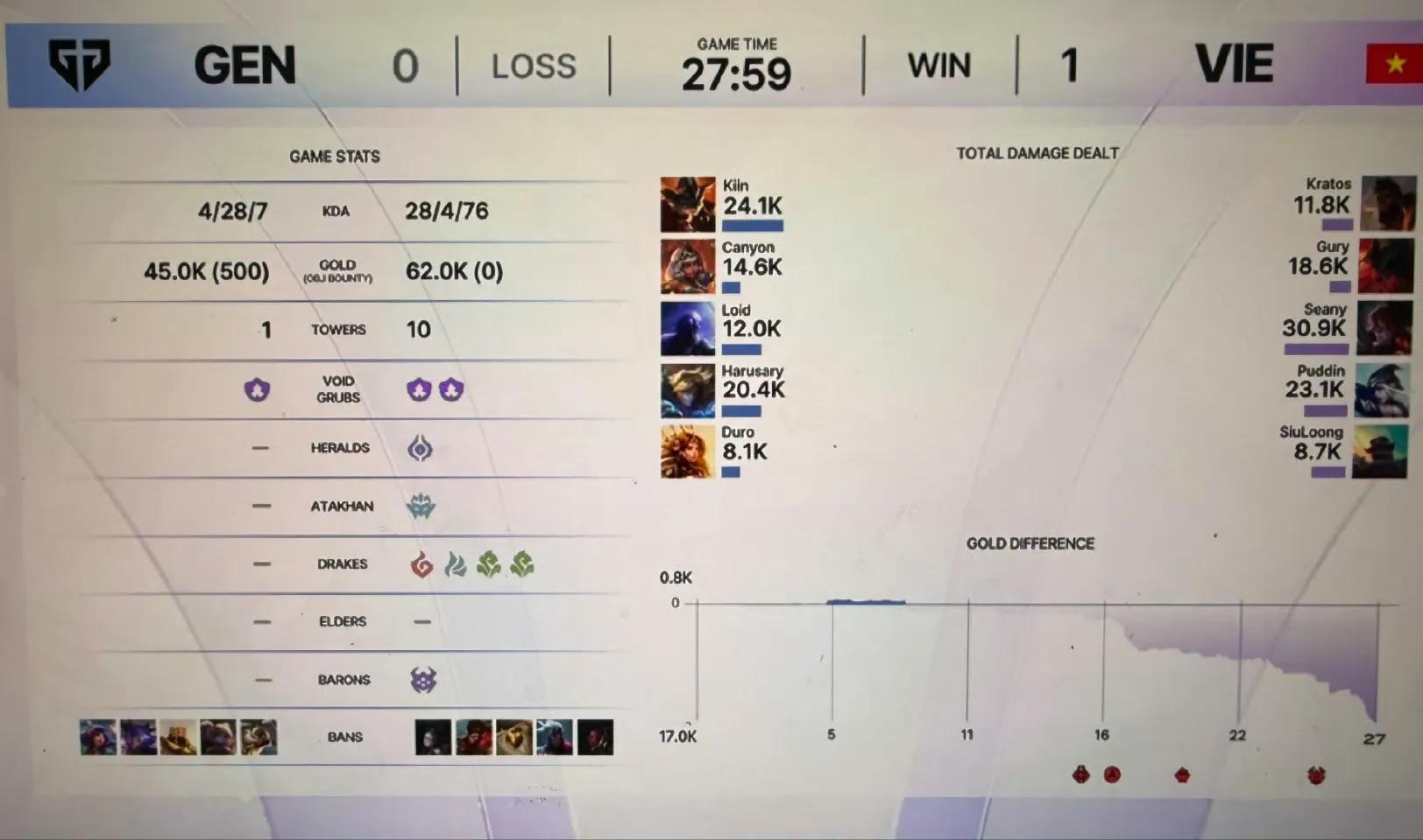 與越南隊的第二場對決更加離譜,僅進行八分鐘,越南上單奎桑提就在上路越塔單殺了Kiin的蘭博,上路河道的劍魔也直接擊殺了Gen戰隊的野輔。同期越南隊拿下三個人頭。17分鐘輕鬆打出零換五團滅,越南隊取得巨大經濟優勢。不到28分鐘,Gen再次被平推,人頭比達28:4。賽後,Gen戰隊迅速成為眾矢之的,畢竟一支世界級隊伍換了兩名選手後,竟連弱隊都打不過,甚至輸給越南隊。