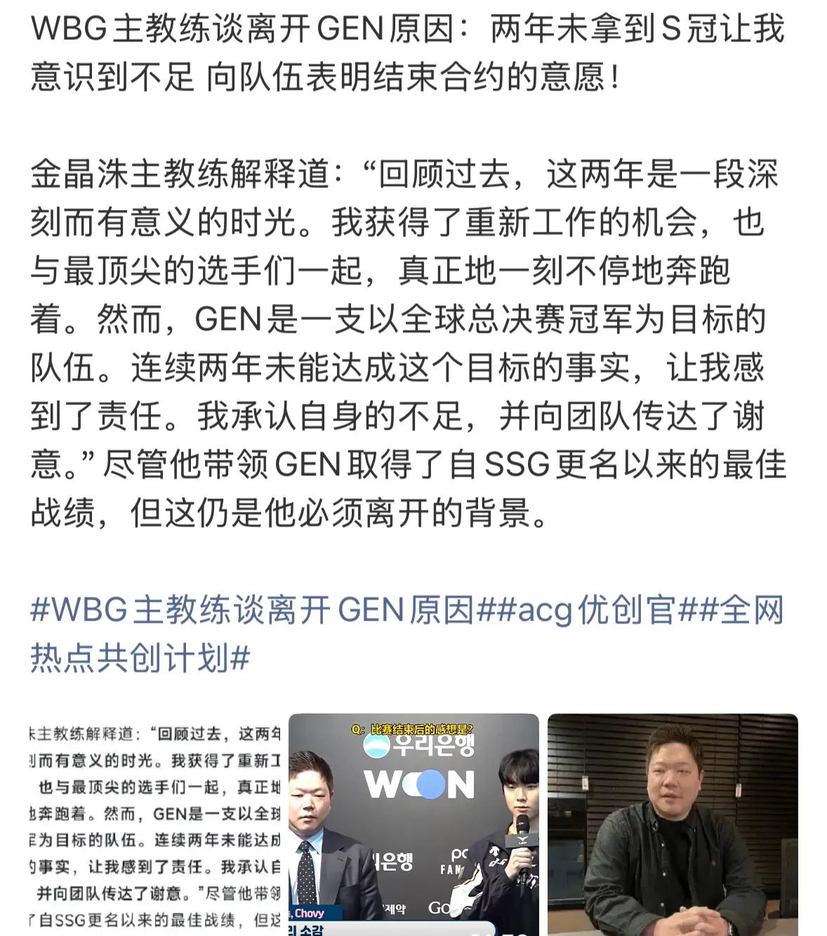 主教練金晶洙在先前接受採訪時曾提及Gen戰隊的問題。這次轉會期,他主動提出離開,加盟WBG戰隊。他表示Gen戰隊是一支追求世界冠軍的隊伍,連續兩年執教卻未能帶隊達成目標,因此感受到自身不足,故選擇主動離開。不知此回應是否另有深意,或是兩年時間讓他看清了這支隊伍。確實,Gen戰隊每次賽區內部對抗表現出色,中單Chovy也成為LOL年度選手,但到了世界賽卻屢屢出現問題。