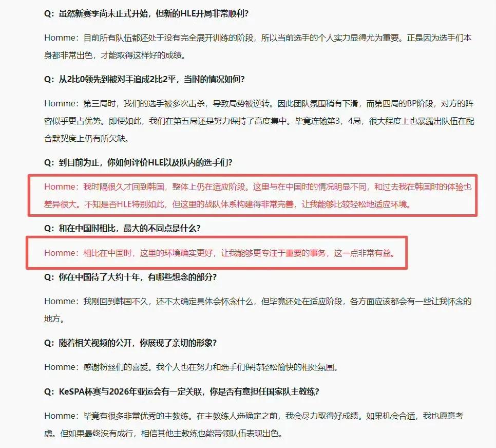 Homme在採訪中表示,自己時隔許久才回到韓國,目前還在適應階段,這裡與中國的情況明顯不同,與過去在韓國的體驗也有很大差異。不知道是否HLE特別如此,但這裡的戰隊體系建立得非常完善,讓他能較輕鬆適應環境。相比中國,這裡的環境更好,能讓他更專注於重要的事情,這點非常有利。甚至後來他還說,剛回韓國不久,還不確定具體會懷念什麼,可能各方面都有些值得懷念的地方。這回答相當委婉,言外之意是在LPL沒有留下任何深刻印象。
