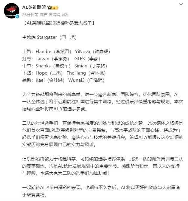 相信絕大多數玩家對LPL仍相當熟悉,作為曾經的世界頂尖賽區,這幾年LPL整體發展迅速,但成績卻日益下滑,這次冬季轉會期可以說是LPL賽區最後的機會了,下季若再被LCK如此無情壓制,整個LPL將徹底跌入谷底。隨著各大戰隊陣容陸續公布,德瑪西亞杯的比賽也提上日程。近日官方發布了各隊參賽大名單,讓粉絲較為意外的是AL戰隊,作為上季成績最佳的隊伍,他們完成了全員續約,但德杯比賽卻派出了二隊首發。