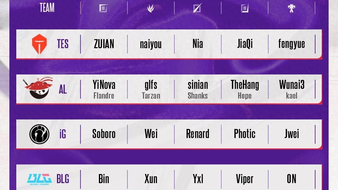 AL遞交了兩份名單,一份為全二隊,另一份為全一隊。為備戰S16賽季,AL一隊近期前往韓國集訓,因此德杯大概率由二隊出戰,若集訓結束AL尚未被淘汰,估計一隊將重新參賽。在排名前六的強隊中,僅京東和微博派出全一隊首發,這兩隊從選手到教練均為一隊陣容。