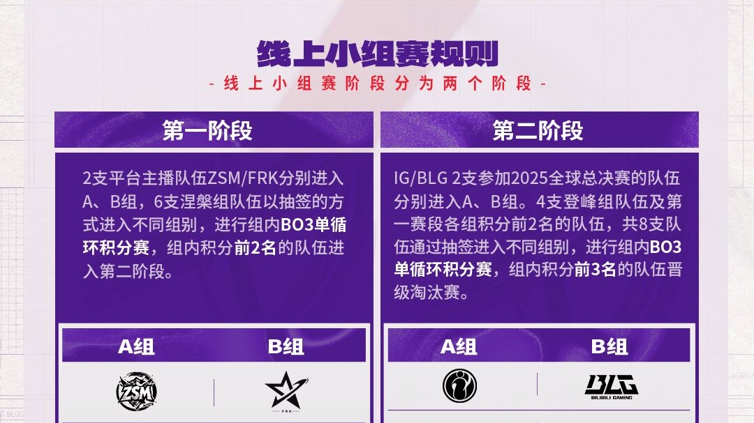 第二階段IG駐守A組,BLG駐守B組。登峰組的JDG、WBG、EDG、NIP四隊將與第一階段晉級的四隊抽籤分組,每組共五隊,進行BO3單循環賽,前三名晉級第三階段,後兩名直接淘汰。最終階段為淘汰賽,AL駐守上半區,滔搏哥守在下半區,六支晉級隊伍將抽籤分組。