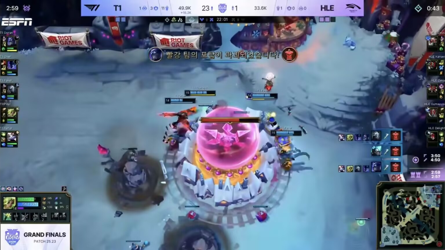 連追兩局的HLE氣勢正旺,觀眾以為T1將翻車,結果全隊狀態爆發,狠狠回擊HLE。多蘭用慎成功反制宙斯青鋼影,對線3分鐘幾乎單殺,Oner見Zeka選卡薩丁,前期瘋狂針對,7分鐘抓死兩次。下路Peyz的澤麗壓制對手,決勝局T1全線佔優,節奏始終掌控,讓HLE無所適從。