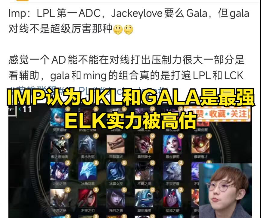 IMP同時認為JKL入選亞運會的可能性比GALA更大,因為GALA有時會在對線中出現小問題,而JKL的對線能力明顯優於GALA。當然也有觀眾希望IMP評價ELK的實力,IMP則表示ELK是LPL最被高估的選手,無論對線還是團戰都稱不上最強,今年ELK被viper取代也合情合理。