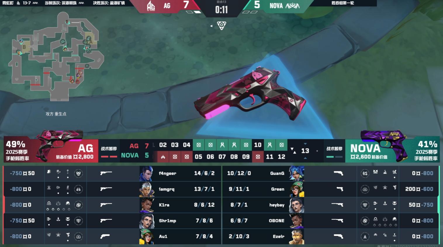 下半場f4ngeer再次展現冷靜残局處理能力,帶隊奪得手槍局。第十三回合NOVA加速進攻A點,憑藉快速攻勢佔領包點成功翻盤。第十七回合關鍵分,NOVA在A二樓擊殺AG三人,迫使AG選擇保槍,NOVA藉此穩住經濟。第十九回合NOVA發生失誤,清點補槍不及時,被AG打出完美團滅。第二十回合賽點局,AG在A點二打二穩健發揮,最終以13-7贏下霓虹町。