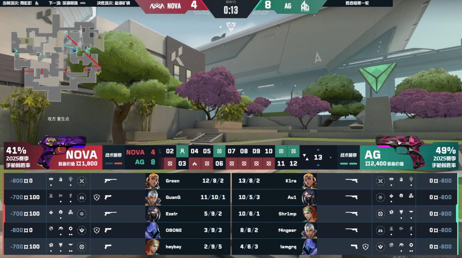 上半場AG贏得手槍局。第三回合AG守包時站位過於分散,NOVA回防迅速抱團拉槍成功拿下。AG在前五回合進攻思路清晰,透過情報慢打拉扯,不給NOVA機會。第六回合NOVA暫停調整,Green在B點防守游龍打出ACE。但AG未受影響,穩扎穩打連續拿下四分,上半場以8-4領先。