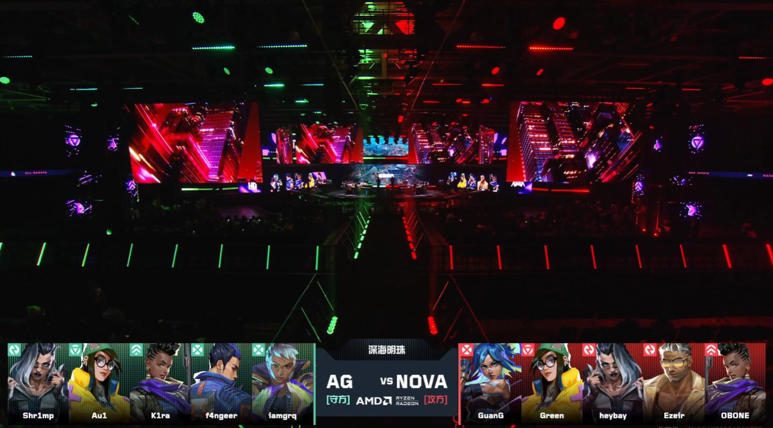 上半場第二回合NOVA的進攻指揮誘使AG失誤,Green成功抓到AG兩個背身。NOVA開局打出四連勝,第五回合AG再度起到長槍,NOVA試圖攻打A小避開AG的冥駒,但被shr1mp與iamgrq守住A小贏下。AG連續拿下三分,補槍效率驚人。第九回合NOVA使用鈦狐大招進攻A點,點內交手中f4ngeer冥駒收割残局。第十回合NOVA在B點架設防線,結束連敗。上半場AG連續追分,打亂NOVA的進攻節奏,以兩分領先結束。