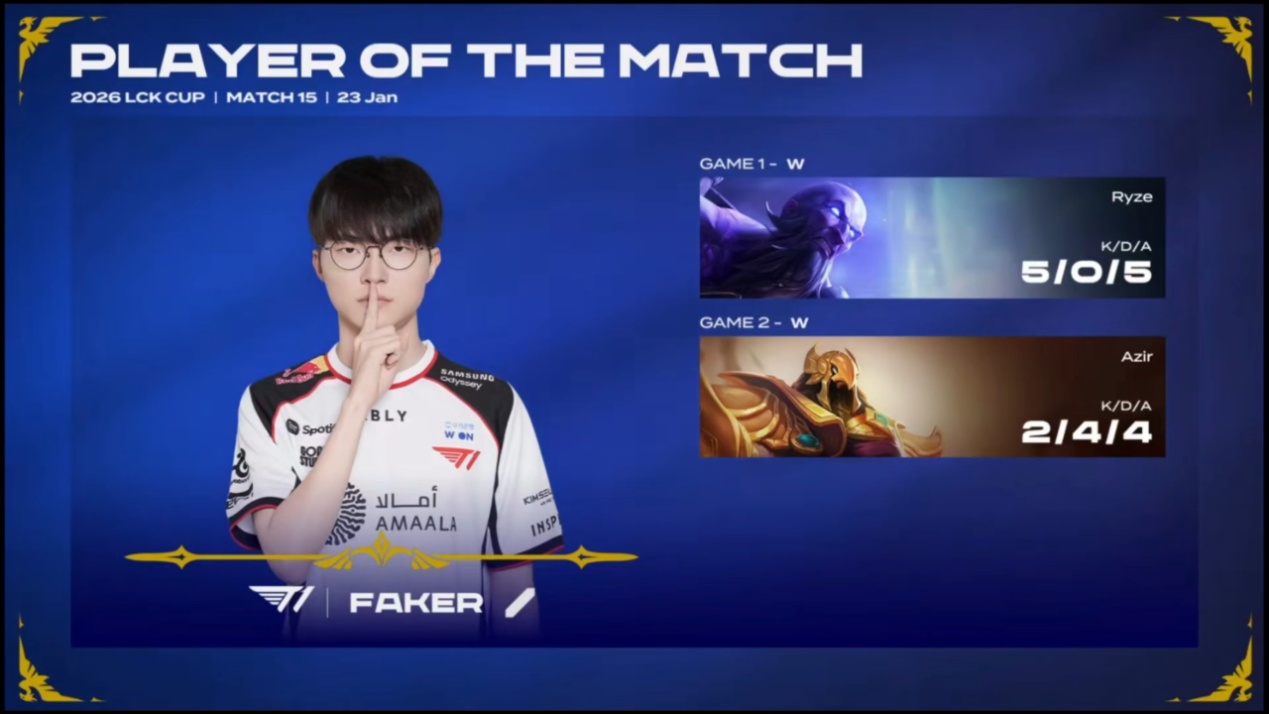 第一局比賽中,T1選用了輔助麗桑卓,且效果不俗,僅兩分多鐘,T1中下路便直接開花,Faker瑞茲對線BDD岩雀時打出完美單殺,Faker先用一套技能將BDD打殘,隨後閃現接連招完成擊殺。