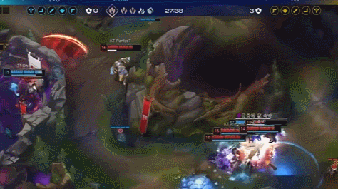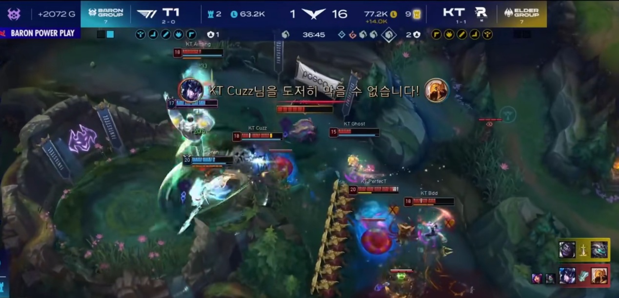 隨後KT兵分兩路繼續推進,上中下高地對抗T1上中路,結果BDD失誤,Faker使用金身後他也跟著用金身,錯過輸出時機未能擊殺。