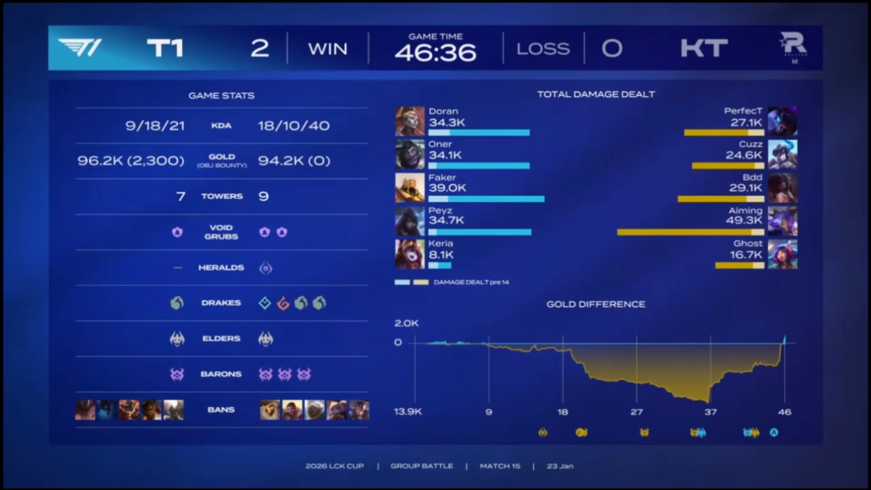 Cuzz嘗試在高地開團反被瞬秒,隨後團戰爆發,KT試圖擊殺Peyz,卻被Peyz紅刀反擊,T1一波團滅對手後直接結束比賽。