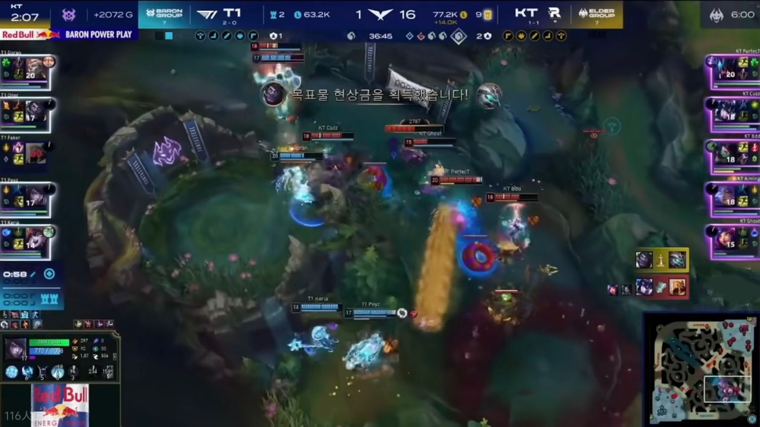 比賽進行到20分鐘時,KT人頭比達到10:1,經濟領先4000,隨後團戰連連獲勝,30多分鐘時手握龍魂和大龍,經濟領先1.3萬,帶著大龍Buff,KT推掉了T1三路外塔。看到這裡,大部分觀眾應該已經退出直播間,準備看決勝局,結果劇情反轉,最關鍵的遠古龍團,Oner搶到龍。