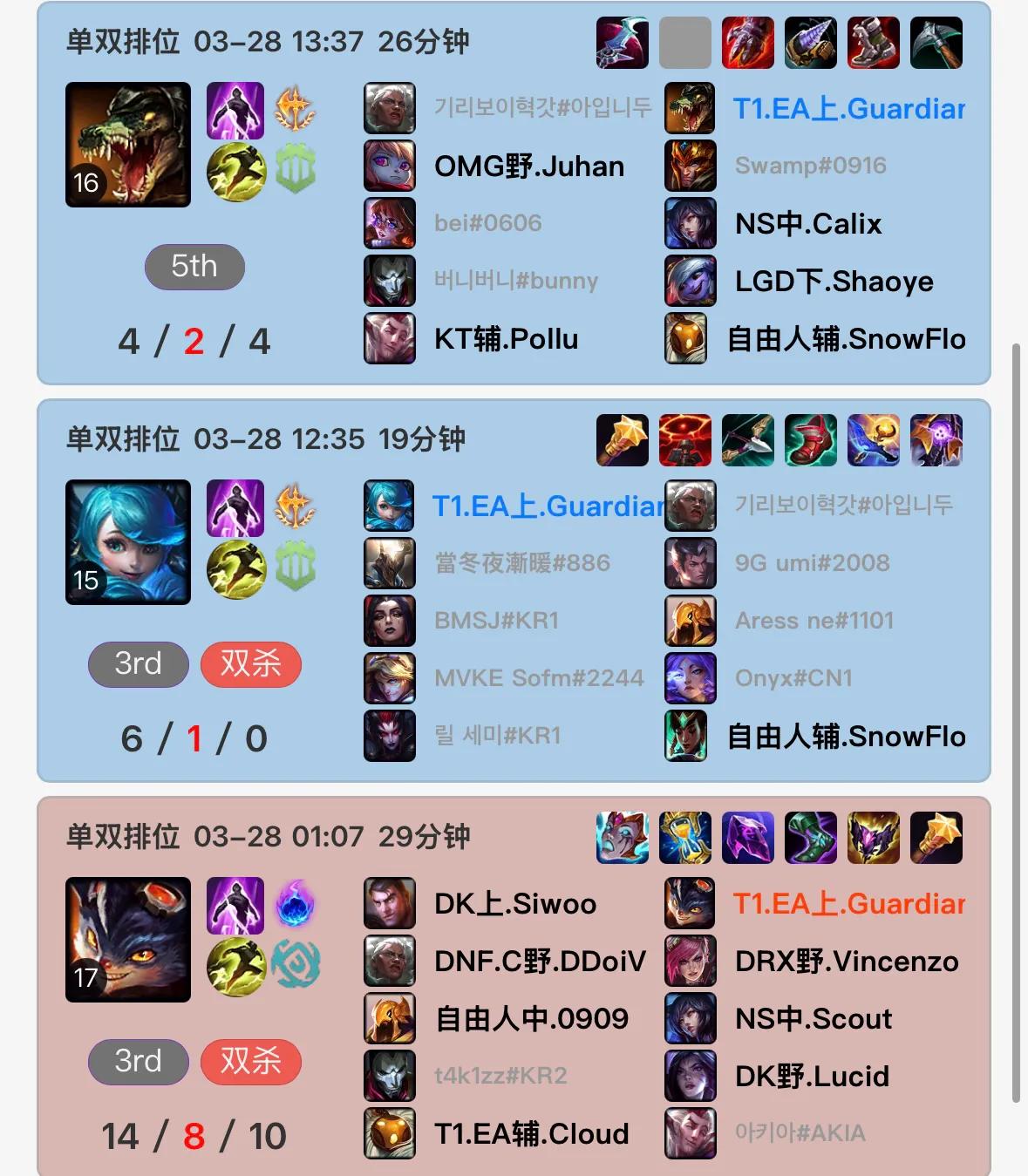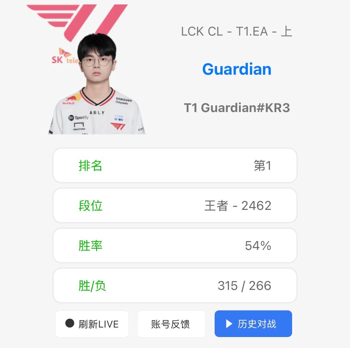 As the second stage gradually approaches, many professional players have resumed normal training. Recently, the Korean server rankings have been updated. T1's youth training top-laner Guardian has reached rank 1, currently at Challenger 2462 points with a stable 54% win rate. Historical records show he focuses on top-lane with a deep hero pool, proficient in tank heroes, AP mages, AD fighters, and even AD heroes like Lucian in top-lane. Contract details indicate this young player's contract with T1 lasts until the end of 2026. Born in 2004, he is currently 22 years old.