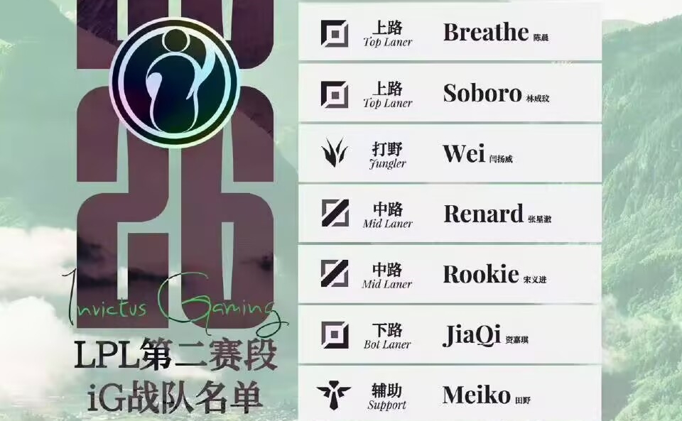 The new bot lane duo consists of TES's Jiaqi and Meiko. In a meta favoring enchanters, Meiko should be quite strong; it all depends on how well they gel. For the mid lane, as rumored online, besides Rookie, the young mid-laner Renard is also on the roster, and he has a 99% chance of starting. Because in IG's official roster announcement graphic, there's a line of very small text stating: Meiko will temporarily serve as captain during the second stage.