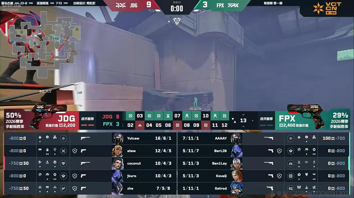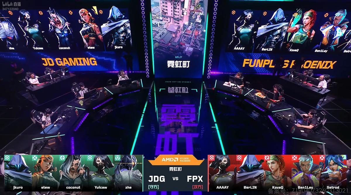 FPX had a perfect 4-0 start in the first half. However, in round five, Yuicaw's lightning-fast triple kill helped JDG reclaim a point and stabilize their economy. A tactical adjustment in round six earned JDG another point, but after a timeout, JDG couldn't withstand FPX's aggressive pushes. In round eight, JDG played an eco round; despite executing a brilliant tactic that wiped out FPX, they lacked time to defuse the Spike. Round ten featured a major ultimate exchange on site A, with JDG ultimately prevailing. The score gap gradually narrowed, and a triple kill by jkuro in the final round of the half ended it with FPX leading JDG 7-5.