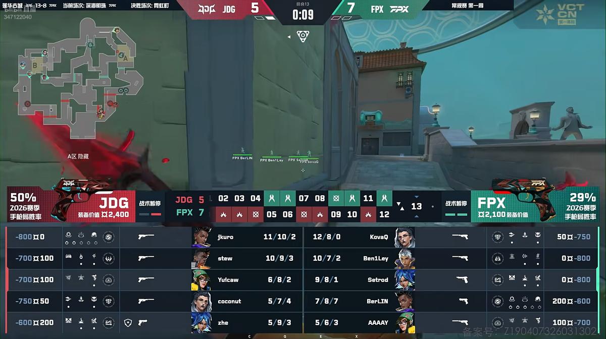 FPX again took three consecutive rounds in the second half. In round fifteen, Ben1Ley secured a quad kill. Round sixteen saw zhe's triple kill help JDG claw back a point. In round seventeen, zhe's quad kill once again stabilized JDG's position. In rounds eighteen and nineteen, multiple kills by Setrod and AAAAY directly propelled FPX to match point first, with AAAAY finishing the job. FPX defeated JDG 13-7.