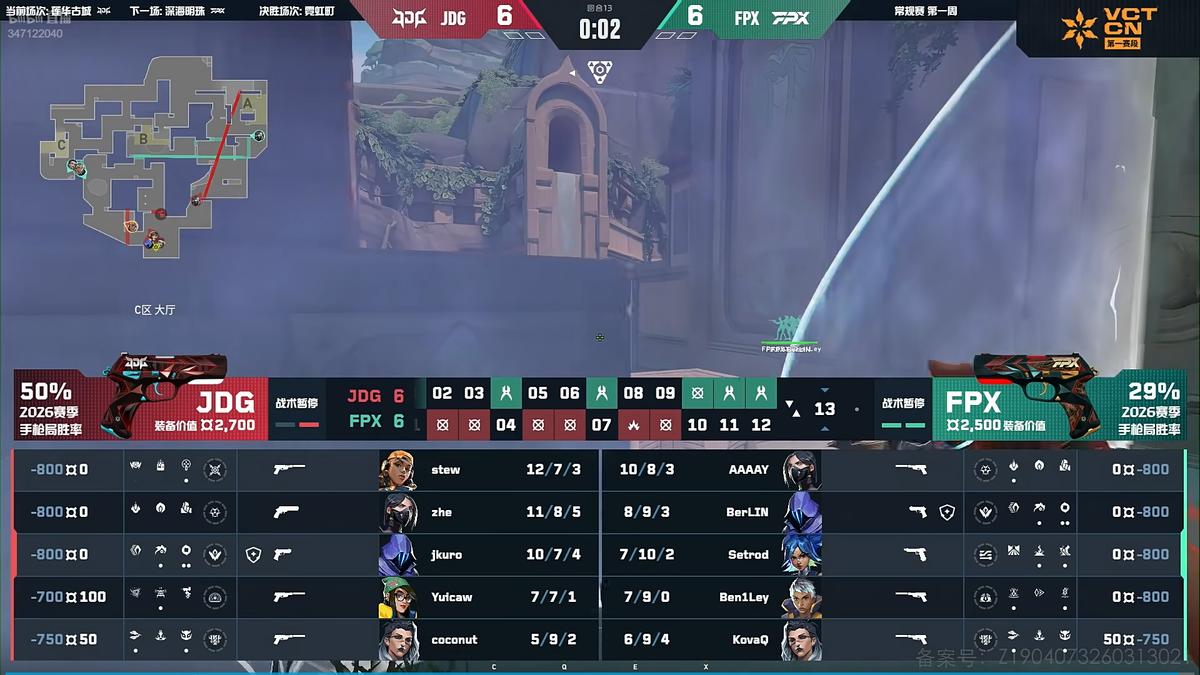 In the pistol round, stew started the first half with a swift quad kill, helping JDG take the opening point. However, the anti-eco round saw kovaQ turn the tide with a triple kill using the Stinger on site B. Both teams traded blows in the rifle rounds. JDG called a timeout after round six, and upon returning, they began to claw back points. In round ten, coconut and stew combined for a double five-kill at the B site entrance, catching FPX off guard. JDG also won the final two rounds through superior gunplay, ending the first half tied at 6-6.