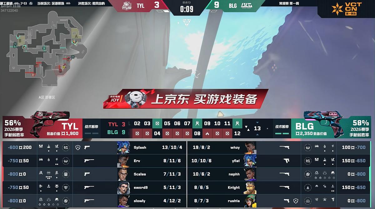 In the final round of the first half, Splash secured a triple kill with the Operator, then used his ultimate to eliminate another, ending with a quad-kill. Score: BLG 9-3 TYL.