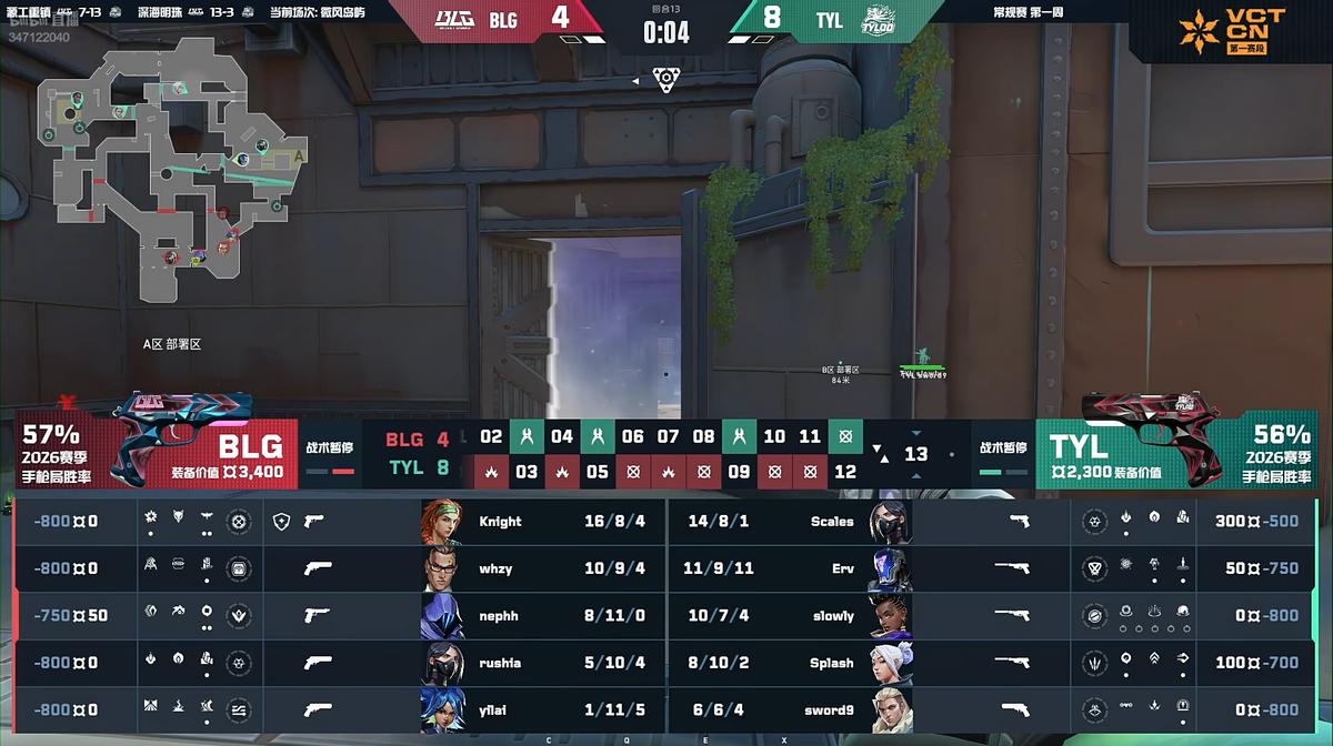 Round nine, Whzy's quad-kill finally helped BLG reclaim a point. Round eleven, Sword9 won a clutch, further extending TYL's lead.
