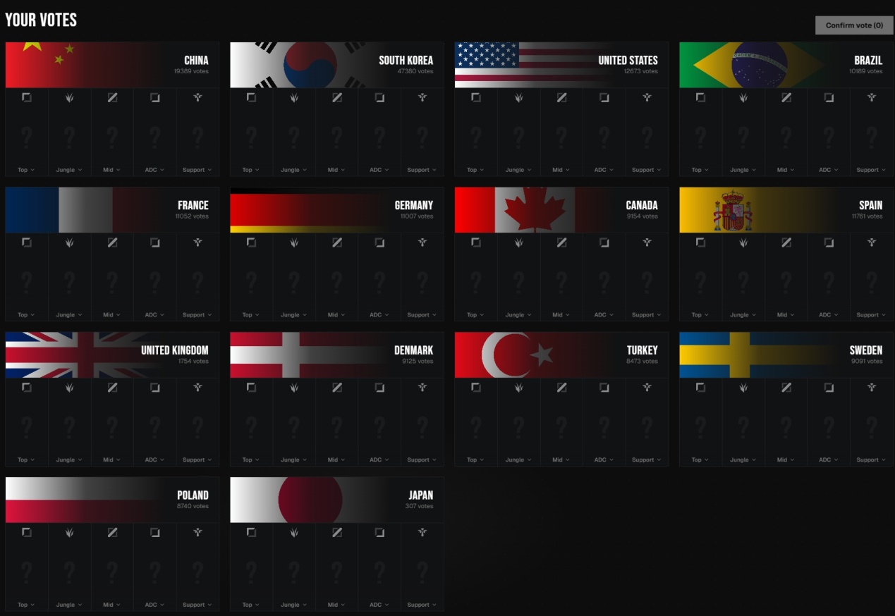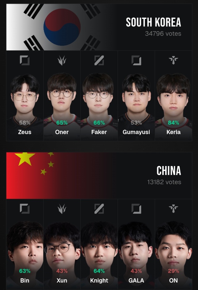 Additionally, foreign media released a voting interface for the esports national teams, polling for the roster each national team's fans most want to see. Interestingly, for the Korean team, the selected lineup is ZOFGK, which is T1's previous championship roster—Zeus and Gumayusi have already left the team.