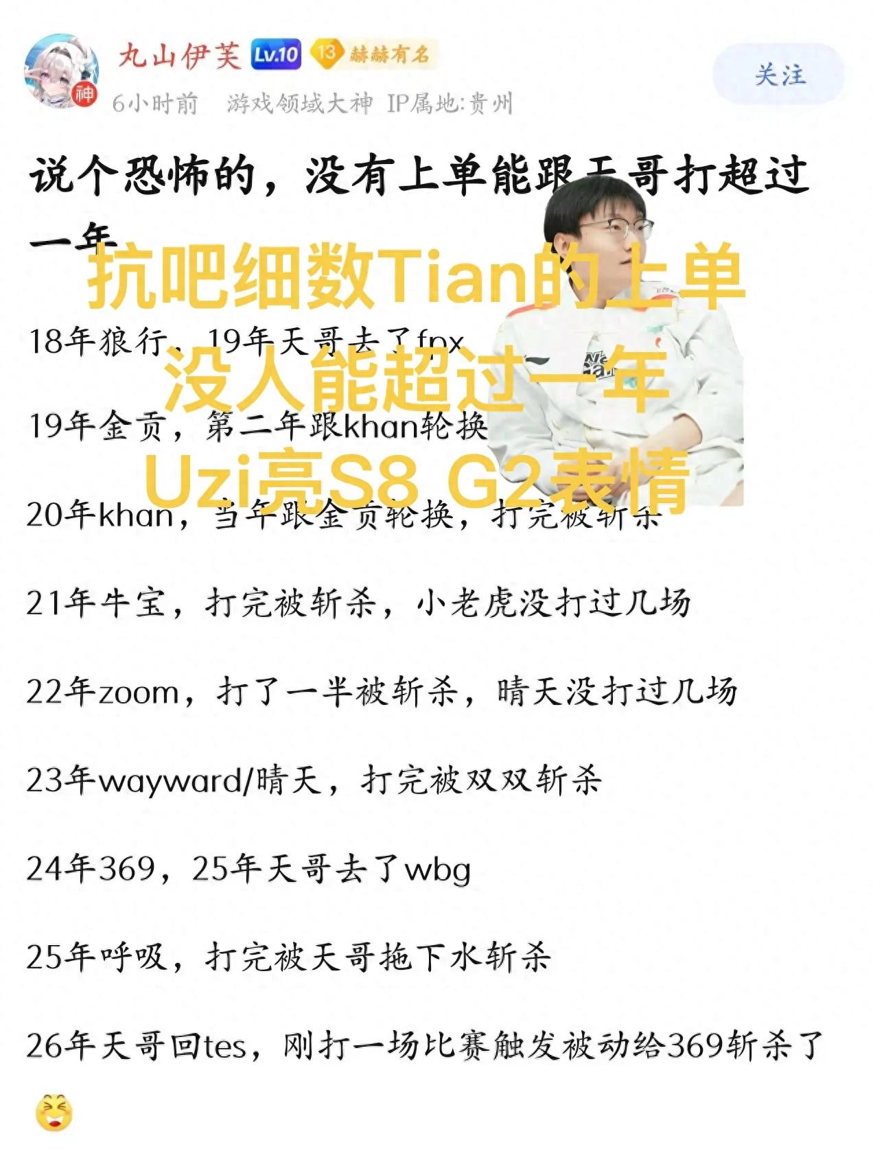 Season 12 had Zoom, replaced halfway by Qingtian. Season 13 included Wayward and Qingtian, both replaced after the season ended. Season 14 partnered with 369, after which Tian moved to WBG. Season 15 teamed with Breathe, and again, all parted ways after the season. In Season 16, Tian returned to TES, and after just one match, 369 took a break. Honestly, it might have been doubted before, but seeing the fans' compilation, Tian indeed hasn't played with any top laner for over a year, except GimGoon during the S9 championship. Could there be a personality flaw? After all, the Iceland incident surely wasn't one-sided.