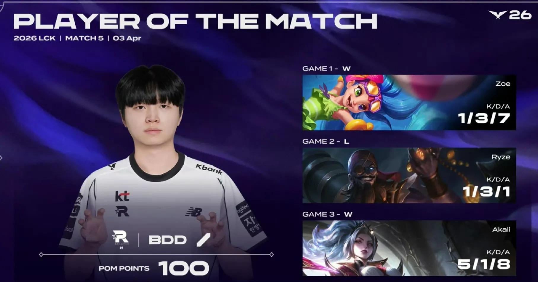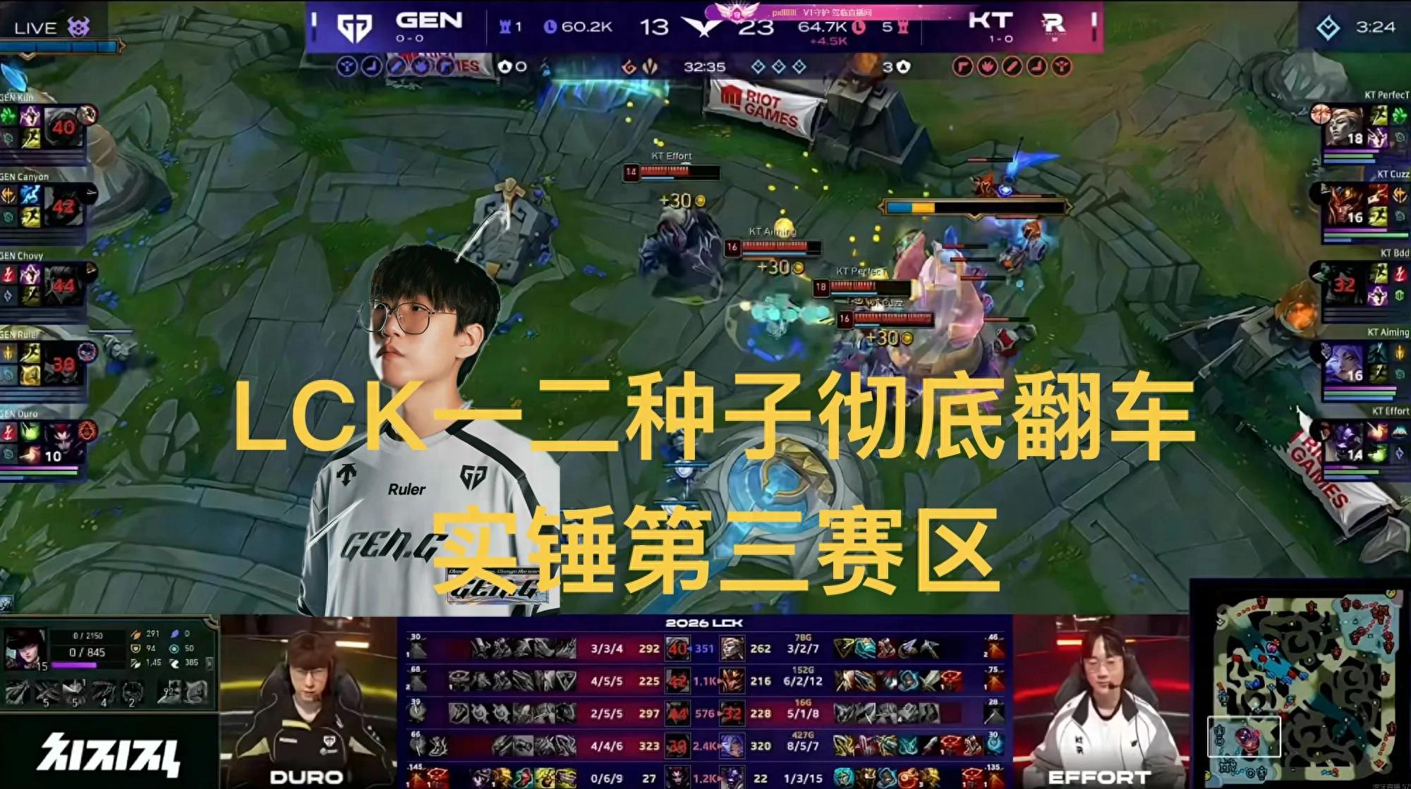 First, regarding the Gen team: their opening match opponent was the KT team. Initially expected to secure a relatively straightforward victory, they were instead overwhelmed with a 2-1 defeat. The first match lasted only 25 minutes, with BDD's Zoe even using a missile to fiercely steal Canyon's Baron, making the gameplay resemble a bot match, and Ruler was completely suppressed. The second match represented the Gen team's normal performance; the KT team's Bard had nearly zero impact, and within just 28 minutes, the economic lead reached as high as 17,000, also resulting in a crushing victory. In the third match, BDD's Akali directly transformed into a killing deity, with Ruler and Chovy being instantly eliminated upon appearance, and Aiming's output was maximized. The KT team has already achieved two consecutive victories since the start, successively defeating the T1 team and the Gen team.