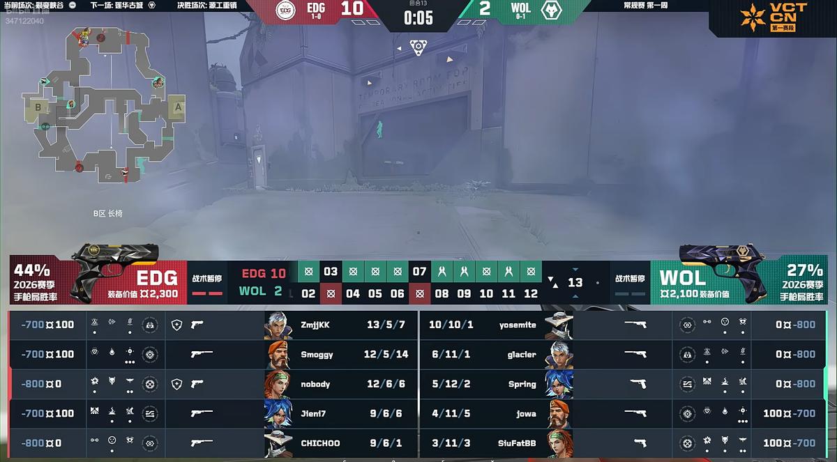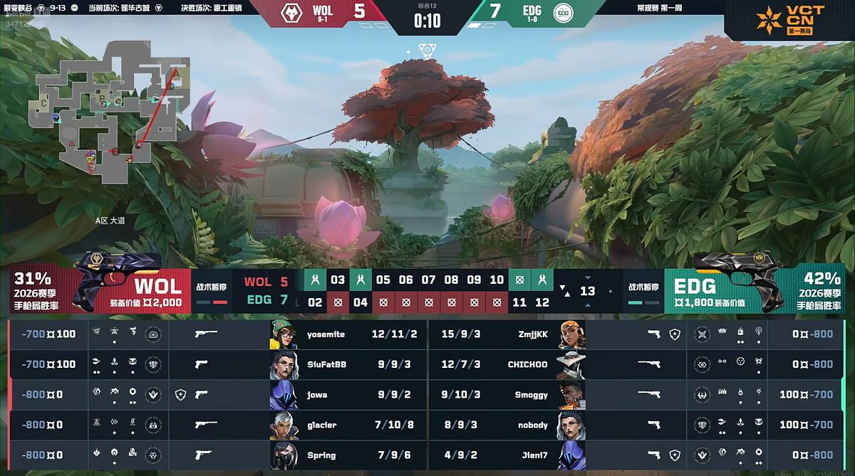 EDG continued to chase points. After round eight, WOL called a timeout. ZmjjKK's sniper play was exceptional, steadily widening the score gap. In round eleven, WOL四人前压 and engaged in a chaotic fight with EDG at the A main entrance, winning through gunplay to recover a point.