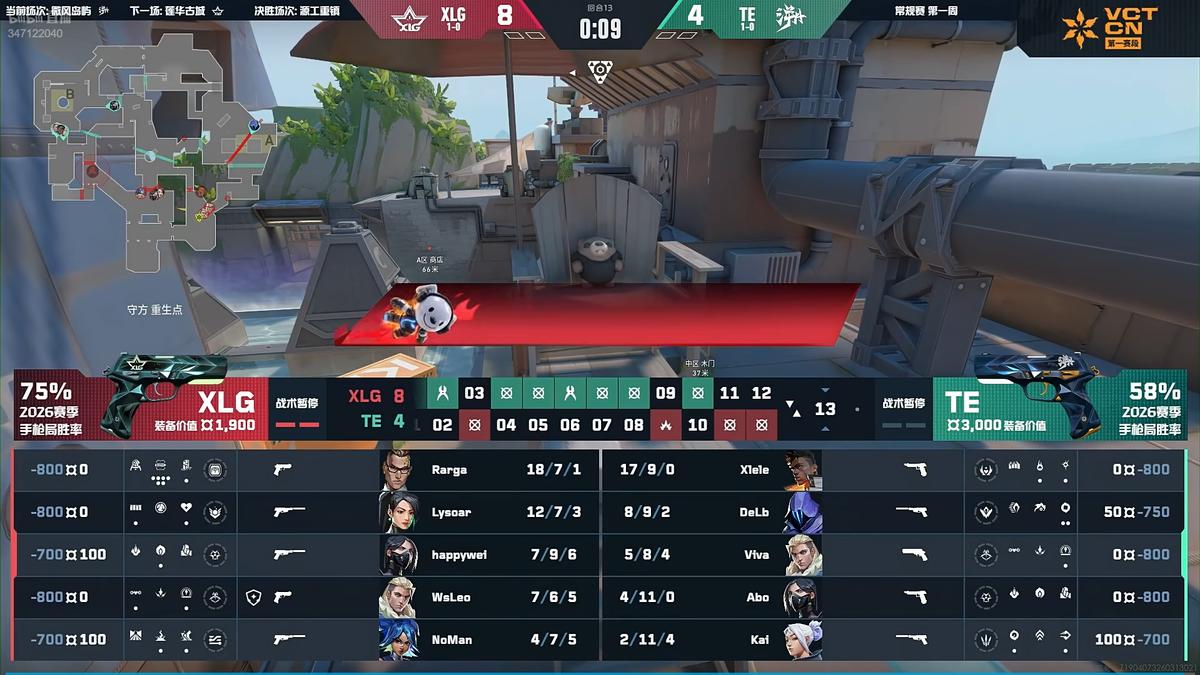 TE's momentum was strong as they aggressively took points. By the end of round nine, the score gap had reached five points. In round eleven, happywei got a triple kill, allowing XLG to finally reclaim a point. In the final round of the half, DeLb completed a 1v2 clutch, bringing the score to TE 9-3 XLG.