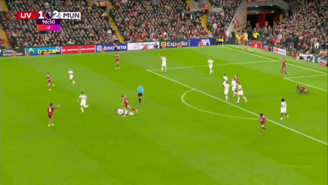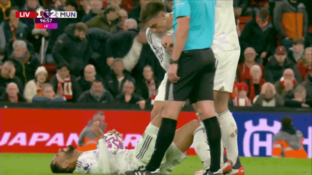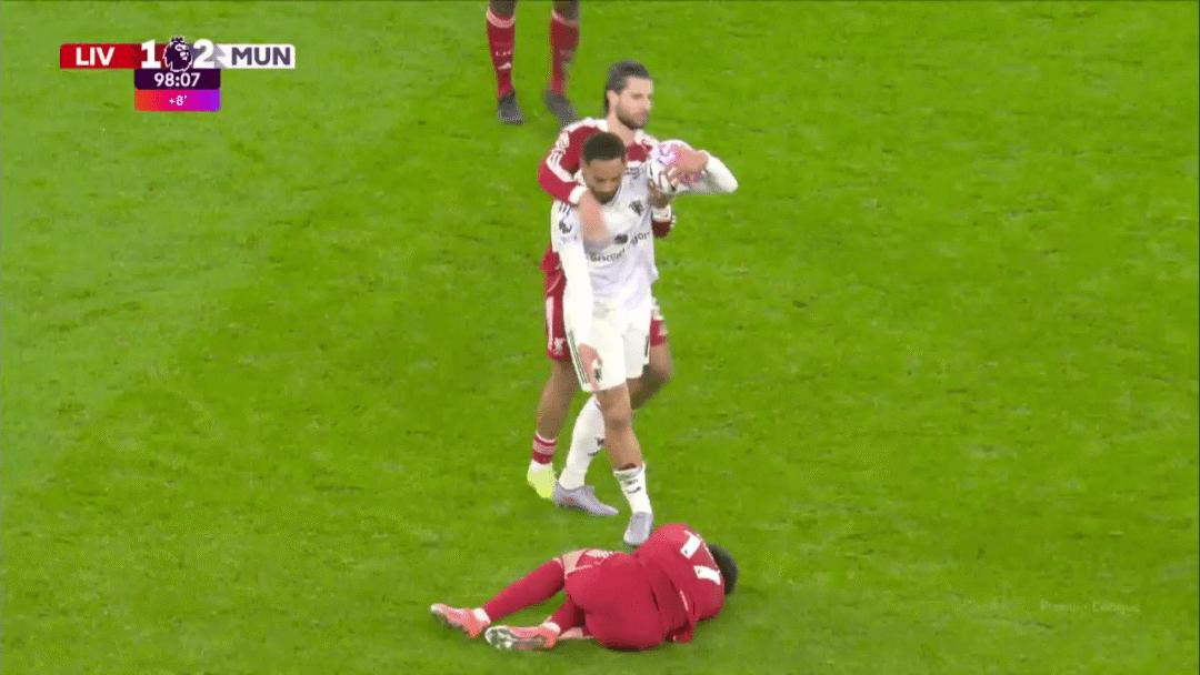 幾分鐘後,他在利物浦半場鏟倒柯蒂斯·瓊斯,隨後與索博斯萊就任意球位置發生爭執。此時著急的是利物浦,而非曼聯。